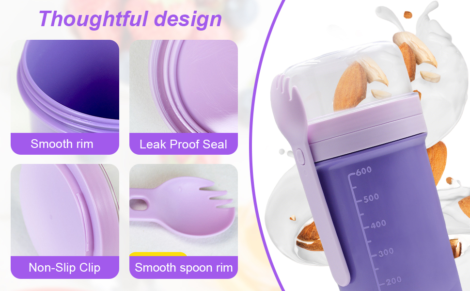 【Cadeau Idéal】Conçu avec des bords lisses et ergonomiques, ce pot à muesli équipé d'une cuillère intégrée s'adresse parfaitement aux amateurs de petit-déjeuner sain. Idéal en cadeau pour les collègues, amis ou la famille!